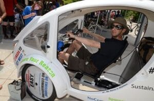 Christopher Sinclair checks out the view from behind the wheel of this solar and pedal powered trike.